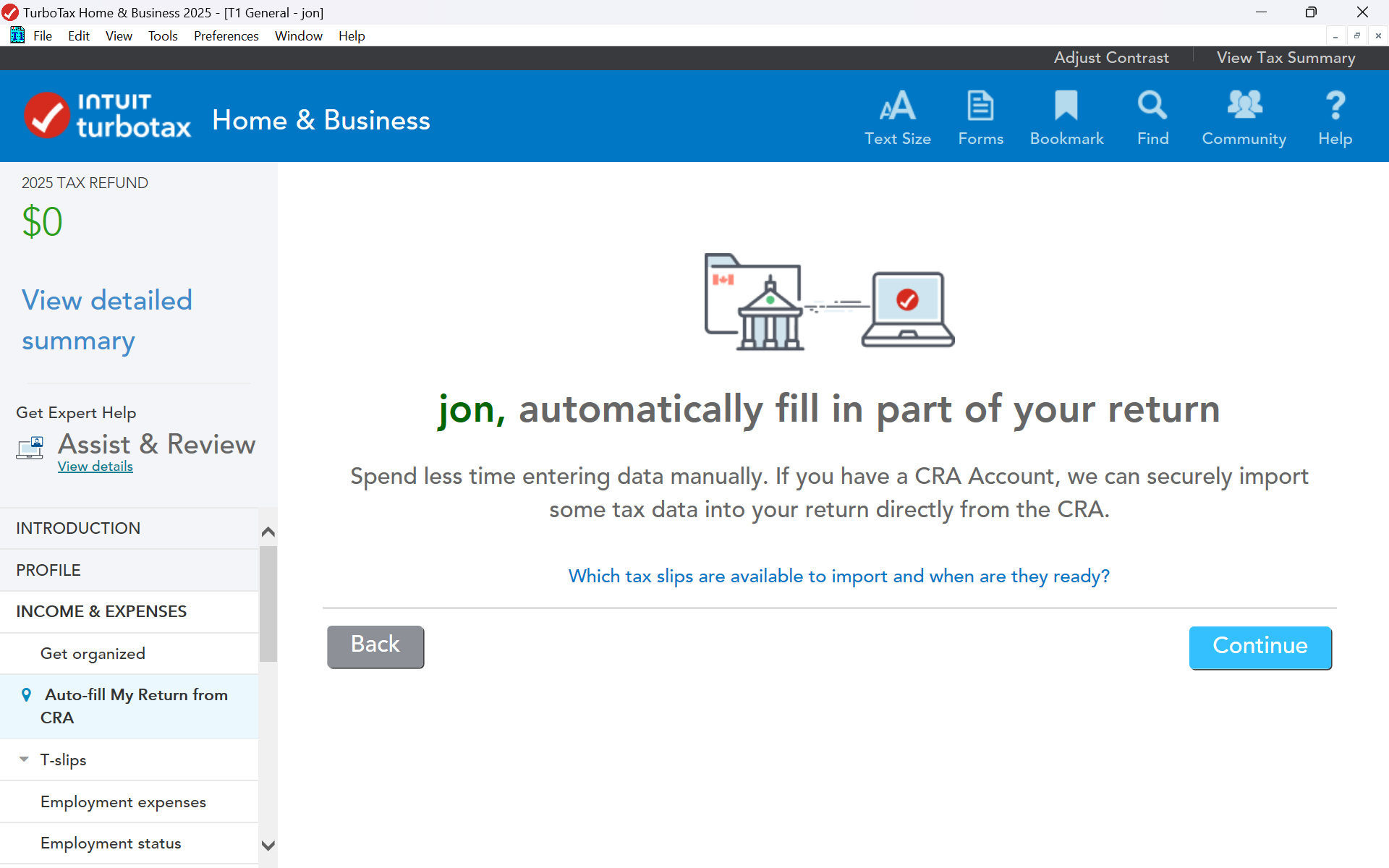Under, Auto-Fill by selecting Income & Expenses, there is no menu item called Import Tax Data from CRA from the left side menu.