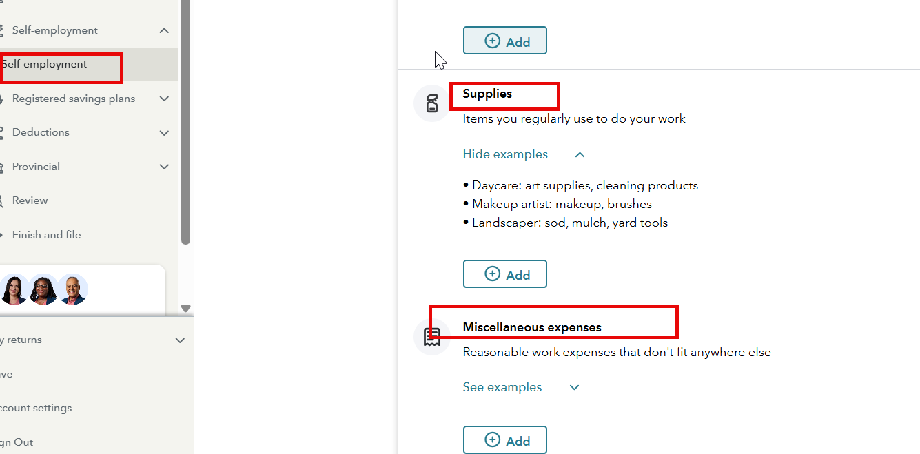 As a self-employed daycare provider, you should input your grocery expenses under "Supplies" (Line 8811) in the T2125 Form (Statement of Business or Professional Activities) in TurboTax.