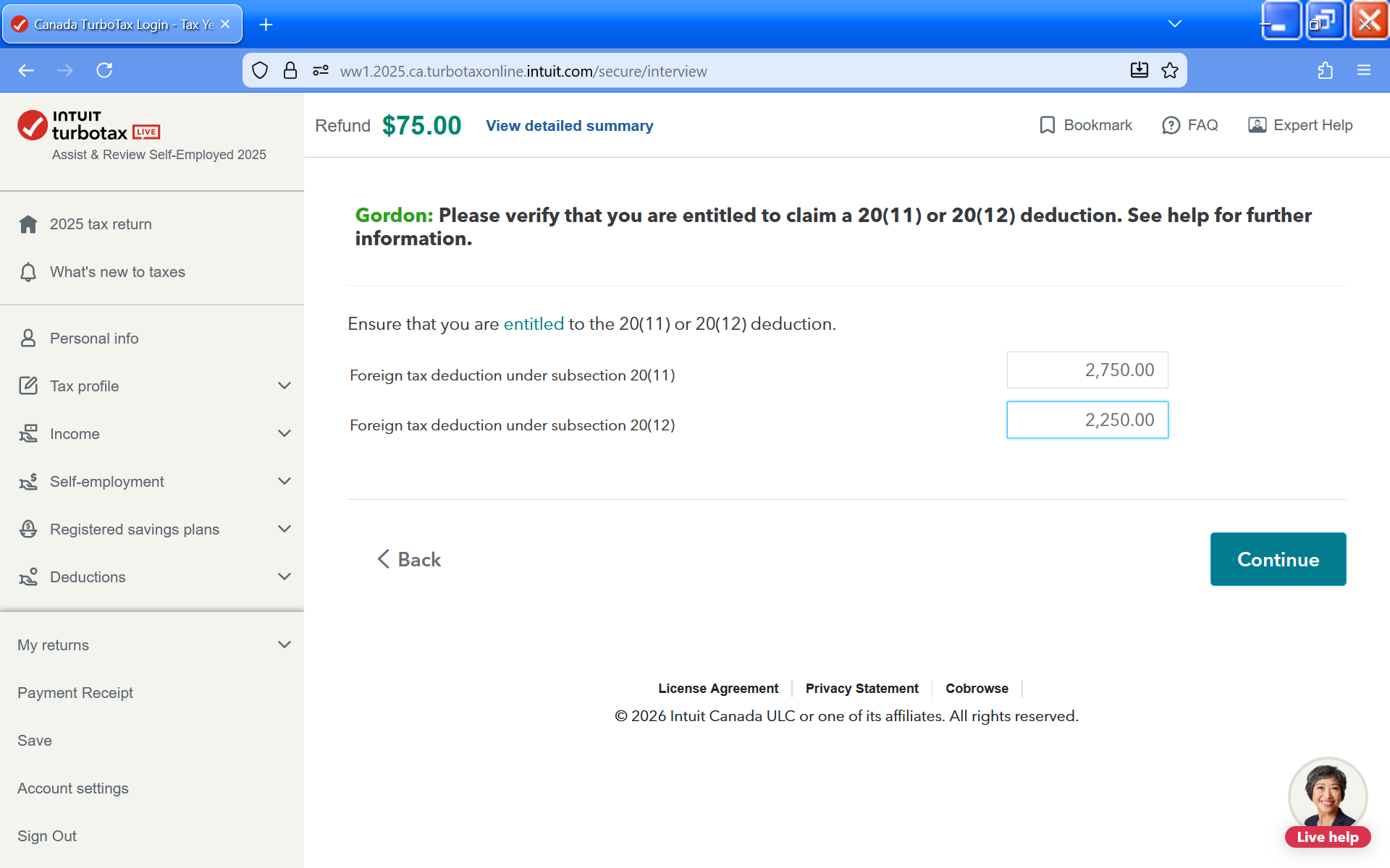 Recall, I'm not the one who enters the 20(11) or 20(12) deduction; TurboTax enters it, in my case by including an amount in line 23200. Let's pretend that I'm able to perform this research and I decide that this number is incorrect. (Apparently that is the decision CRA made last year.) I have performed some research already, using a dreaded AI tool, and learned that the foreign taxes paid should have been claimed as "Foreign Tax Credits" instead of a 20(11) deduction. Still, I didn't do the math; TurboTax did.