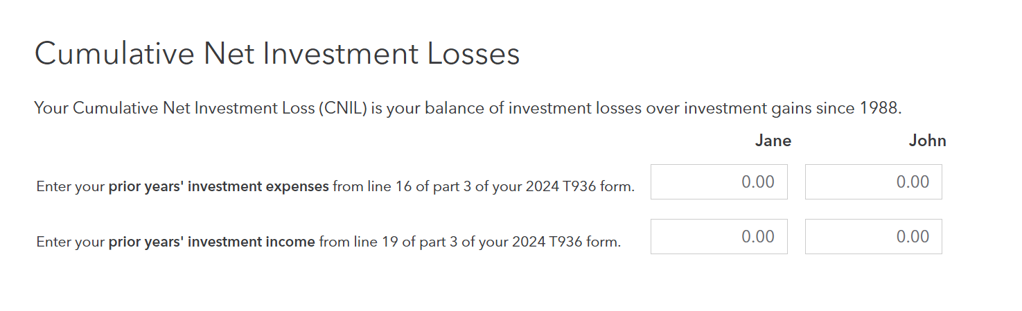 To enter your CNIL from a previous year, go to the Carry Forwards section under the Income or Investment profile. Enter your cumulative investment income and expenses here; TurboTax will automatically post these amounts to Part 3 of Form T936 to calculate your current limit.