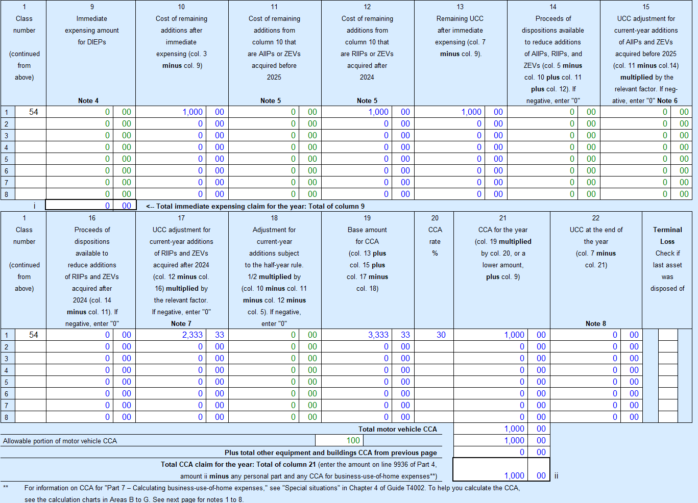 @Cheng42 According to the CRA's 2025 T2125 form: Note 7: Under proposed changes, for ZEVs acquired after 2024 and RIIPs that became available for use in 2025, the relevant factors are 3 (Class 44), 2 1/3 (Classes 43.1, 46, 54, and 56), 1 1/2 (Class 55), 1 (Class 53), 9/11 (Class 50), and 0 (Classes 12, 13, 14, 15, and 59). The factor is 1/2 for any