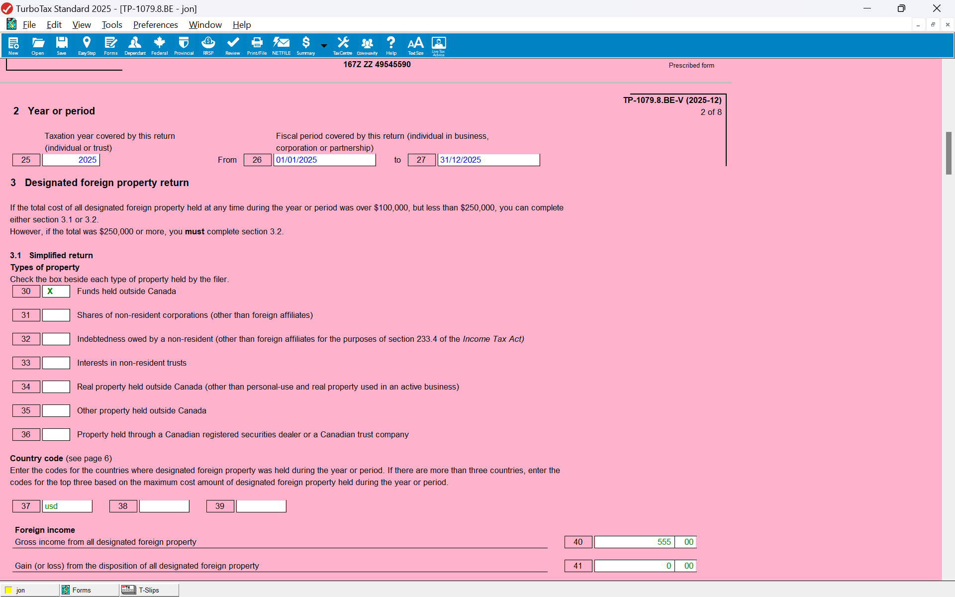 Quebec form TP-1079.8.BE-V is new in 2025.  For the most part, its content should replicate the information found in the corresponding fields in federal form T1135.  As of today, this is not the case.  Values from the T1135 are not copied over (none are, at least for the case where "Part A" of the T1135 is used, I have not tried Part B).  For example, fields such as "country codes" or the check box for "property held in a brokerage account" are blank and lines 40 and 41 remain at zero despite having a non-zero vale in the T1135.