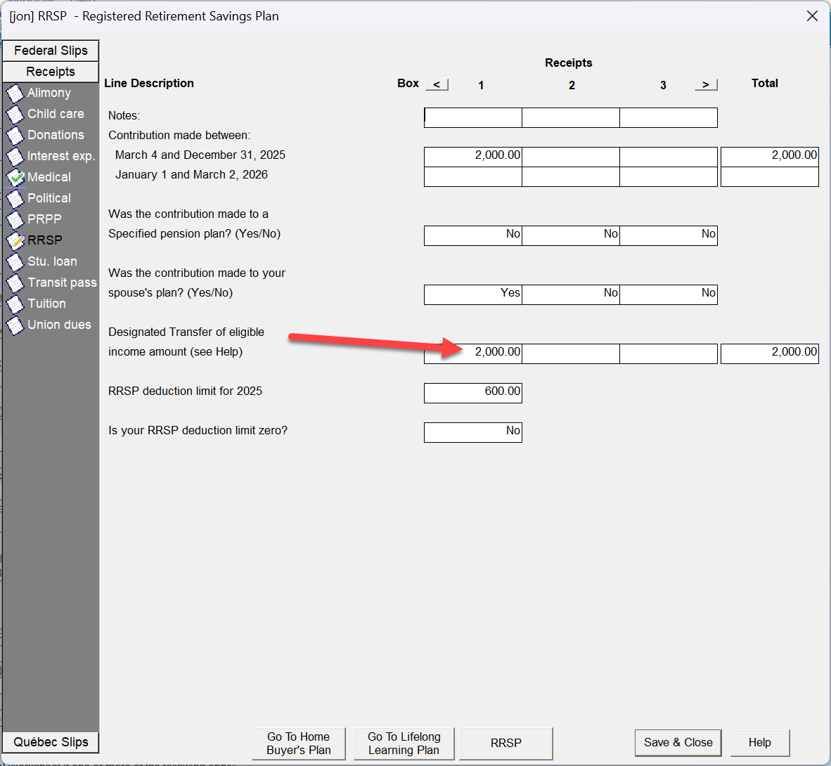 Thanks very much Susan. When I place the 6000 into that designated transfer box, the full amount (ie 6000) does not carry to Schedule 7. It gets limited to my RRSP contribution limit. The designated transfer rules are intended not to be constrained by the RRSP limit. Any suggestions?